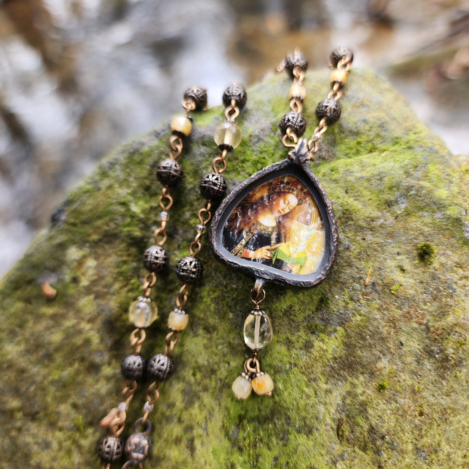 Solid, antiqued bronze illuminata ivy arch amulet  ~ set with Van Eyck Altarpiece ephemera under hand-cut water-textured glass with faceted tourmaline and citrine.