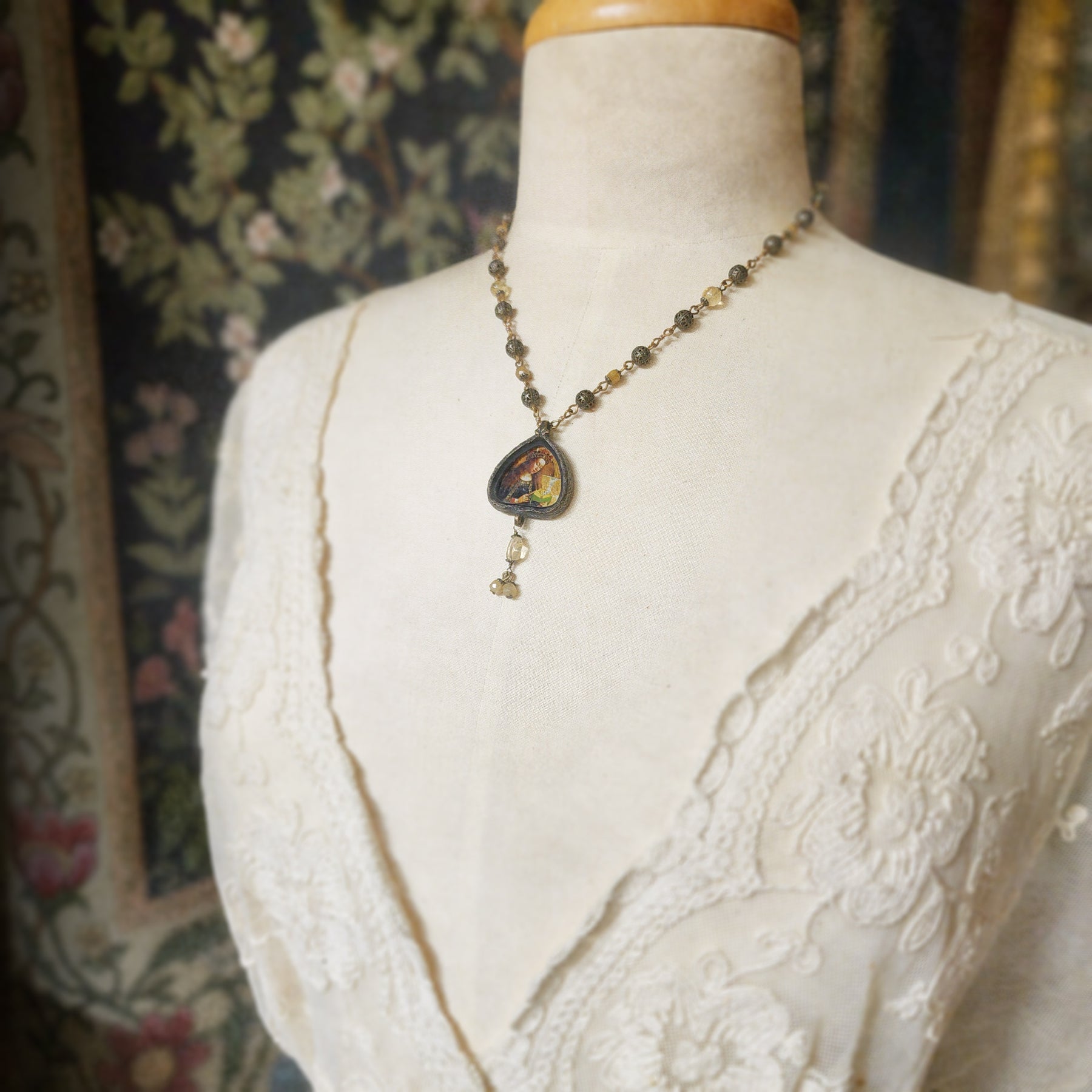 This one-of-a-kind amulet is just over an inch at widest, 2 1/4 inches long including beads. The faceted tourmaline, citrine, iridescent glass & antiqued filigree beaded chain measures @ 18 inches.