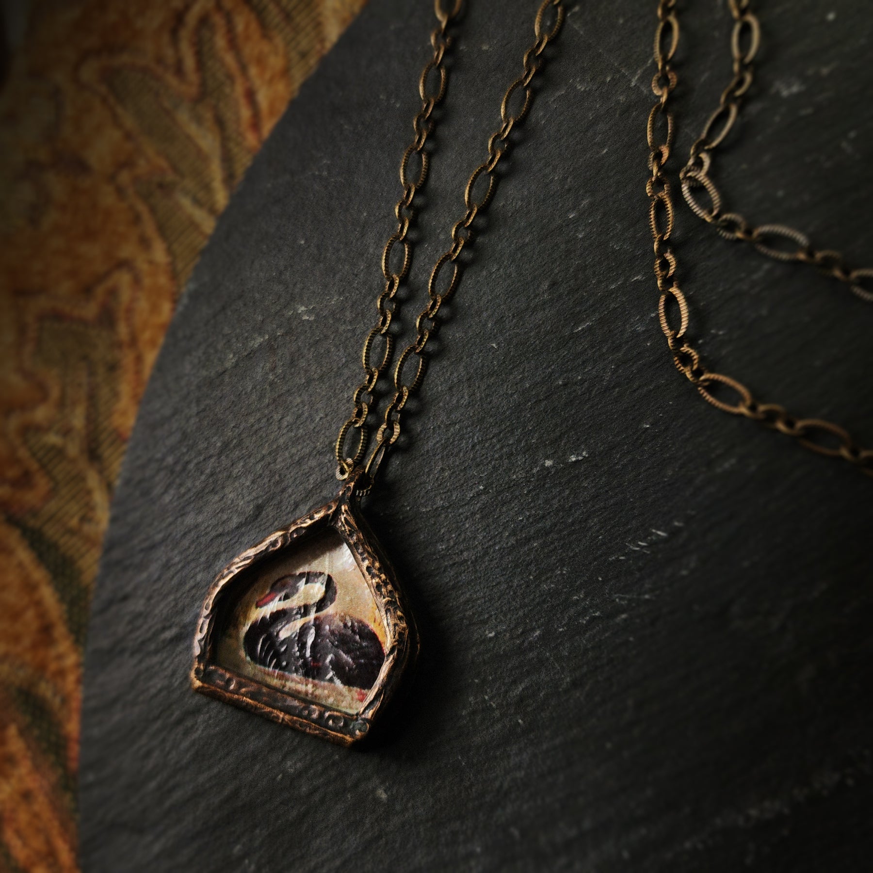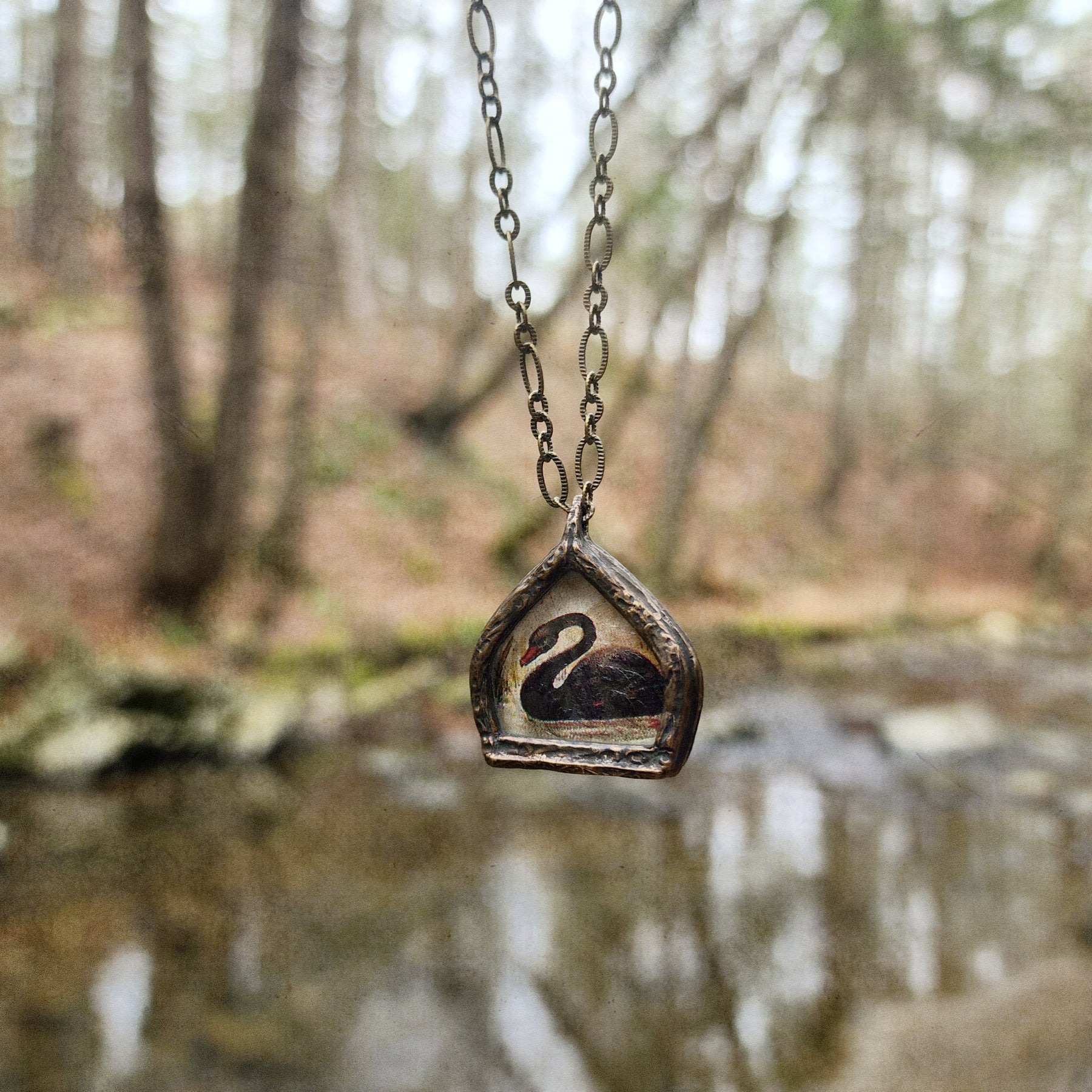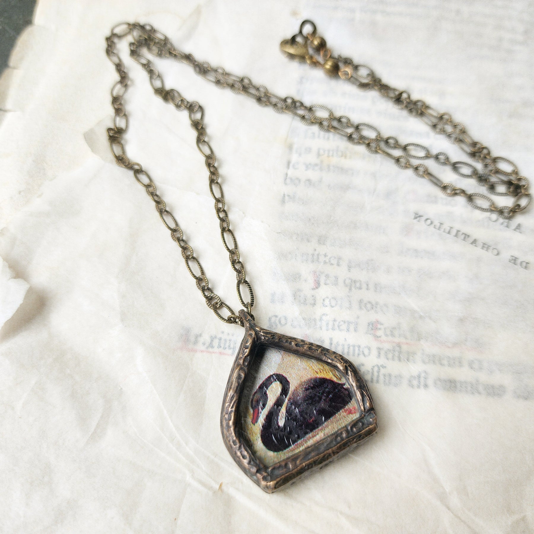 An antiqued bronze arch frame is set with hand-cut textured glass, holding an ephemeral detail of a black swan illustration.  On the back- pyrography & gold-detail painted crown on birch bark from Frog Hollow. (birch is sealed for preservation, but please keep dry)