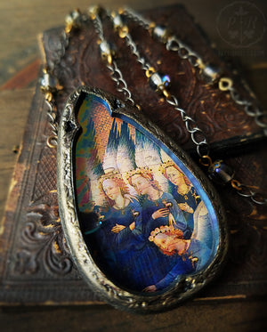 Parrish Relics are one of a kind and handmade in my one-woman jewelry studio at Frog Hollow. Time and care is spent collecting tiny images that I find inspiring and captivating ~ Clay frames are formed around glass to pay tribute to the beautiful artwork they celebrate! Alchemically hand painted to match the metal components in the chains and findings, they become unique adornments that start conversations and are joyful to wear.