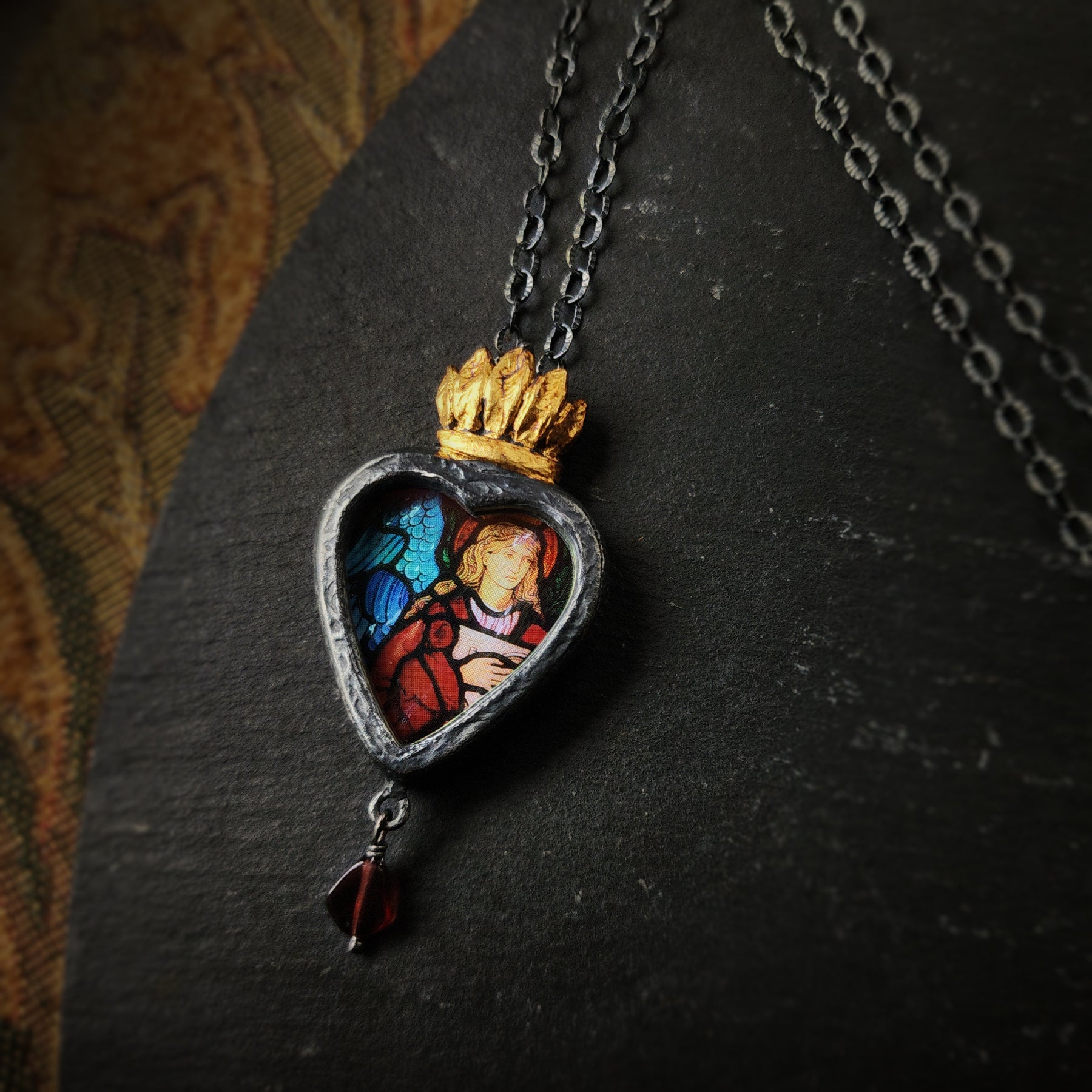 A hand-carved and sculpted frame heart and stylized flames. Cast in recycled sterling silver with an antiqued patina and 24 k gold highlights, set with found image ephemera - an angel in stained glass by William Morris & Edward Burne-Jones- under iridescent glass.