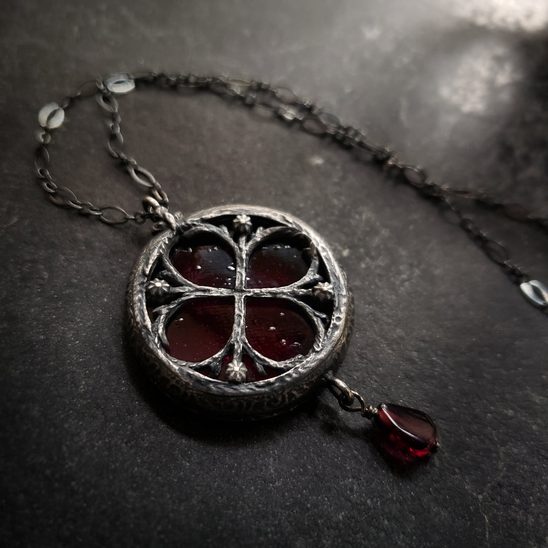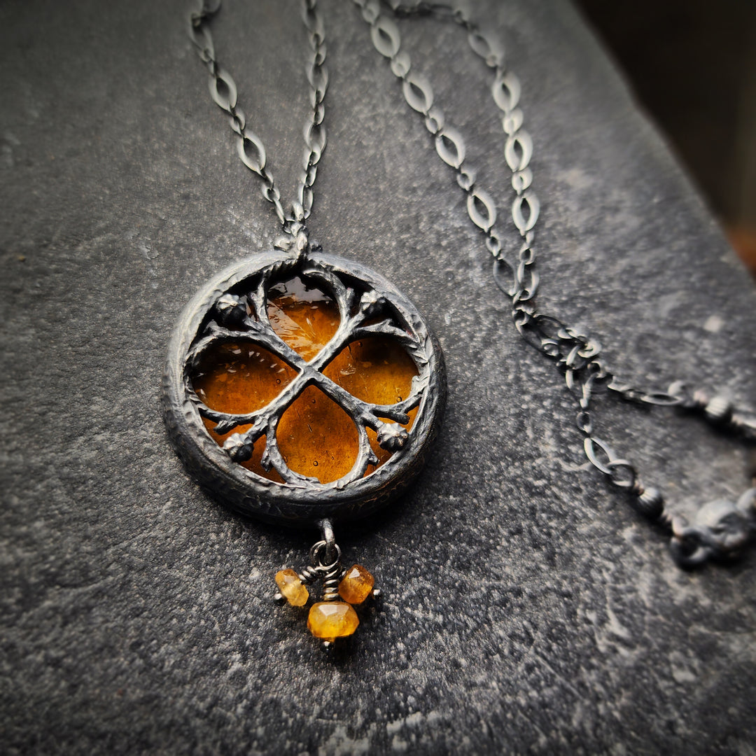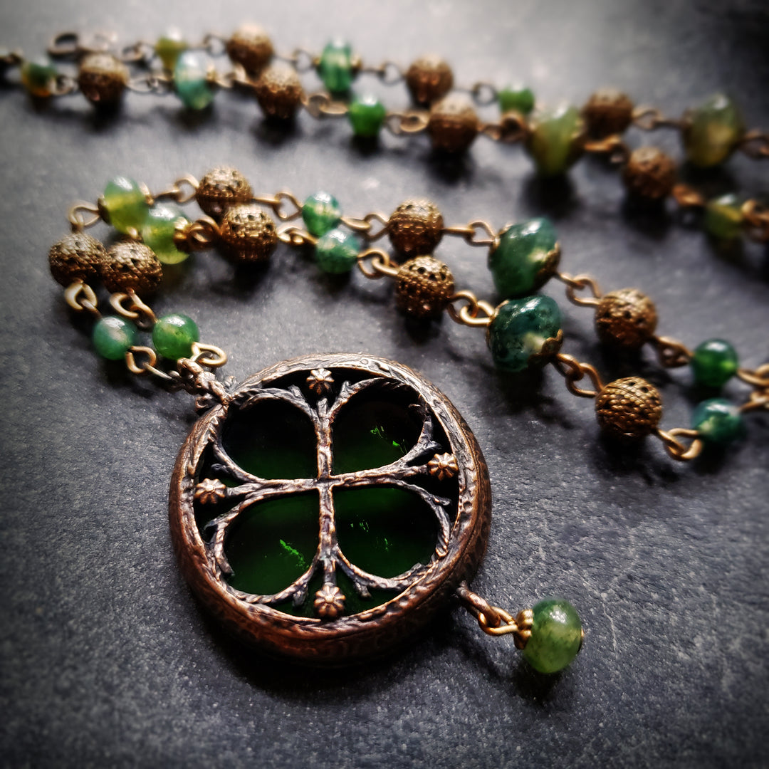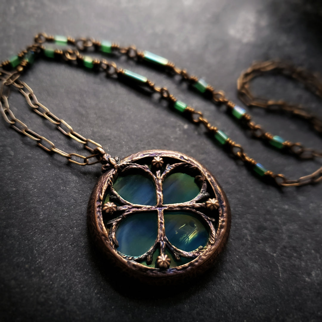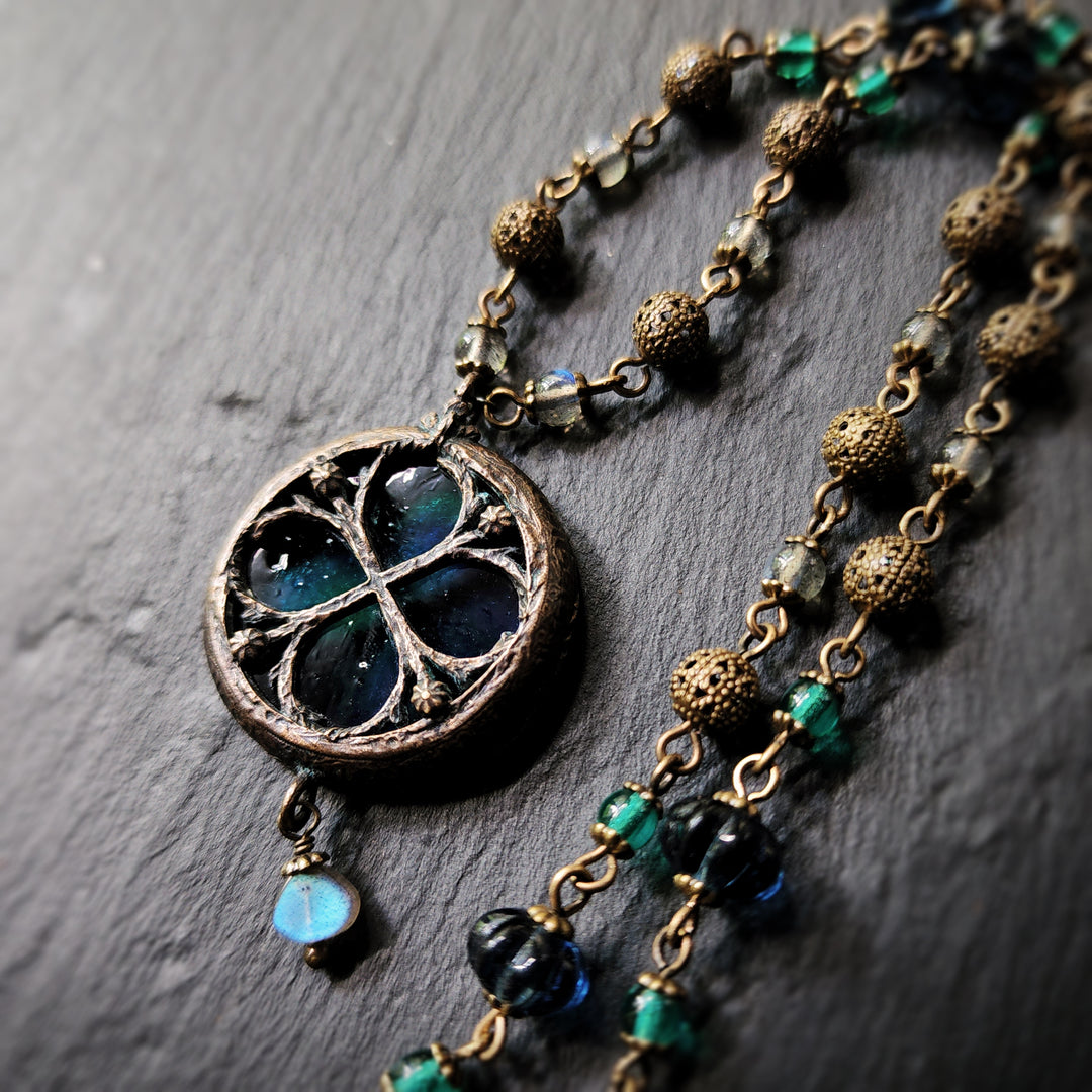 Inspired by the gothic windows at Canterbury Cathedral, created originally for the British Museum's Thomas Becket ExhibitionA hand-carved and sculpted frame echoes the window's curves and curling tendrils of floriated ornament winding around the clover. Cast in recycled bronze, antiqued with the deep patinas of age, and finally set with Jewel-toned hues favored by the Medieval stained glass artists back in the 12th century for an adornment that pays tribute to the architectural beauty of centuries past.