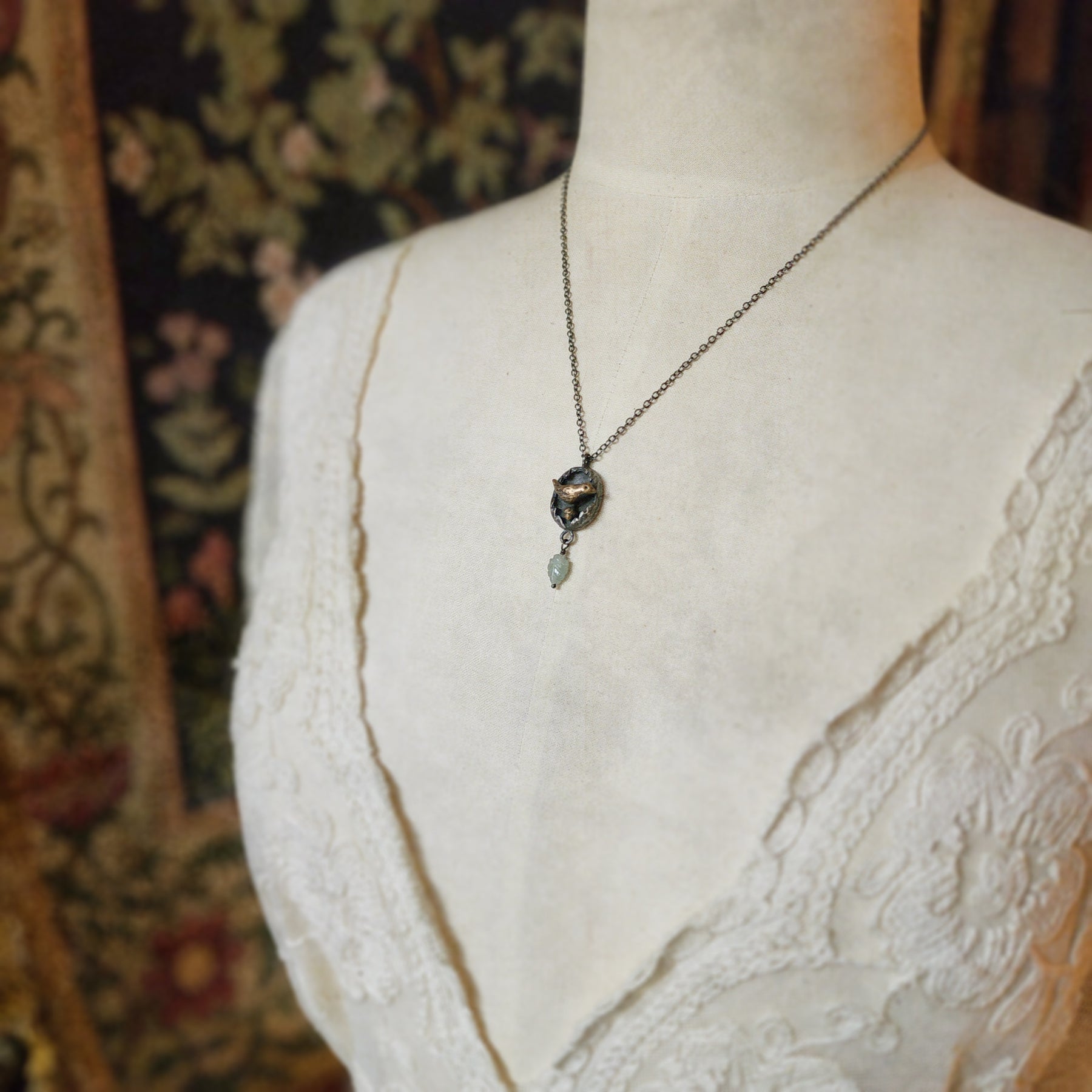 Hand-carved & cast in recycled sterling with antiqued, layered patinas of age - sterling silver oakleaf shadowbox & bronze little bird that sits atop a tiny acorn. Adorned with a carved aquamarine leaf.